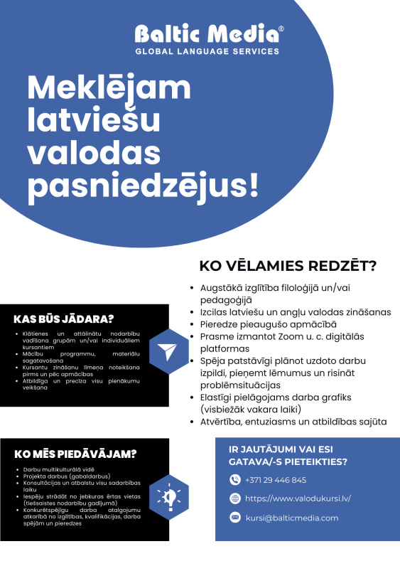 Pieaugot interesei par latviešu valodas apguvi, Baltic Media Valodu mācību centrs meklē papildspēkus – entuziastiskas/-us latviešu valodas pasniedzējas/-us.